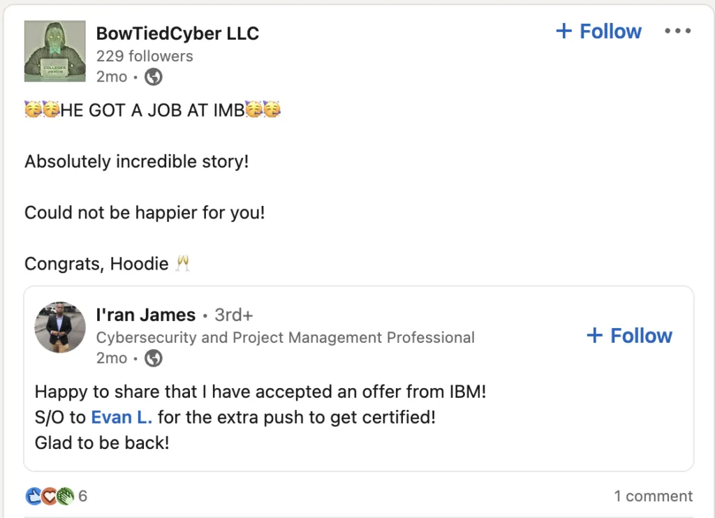 "I have accepted an offer at IBM! S/O Evan Lutz for the extra push to get certified!" -I'ran James, LinkedIn